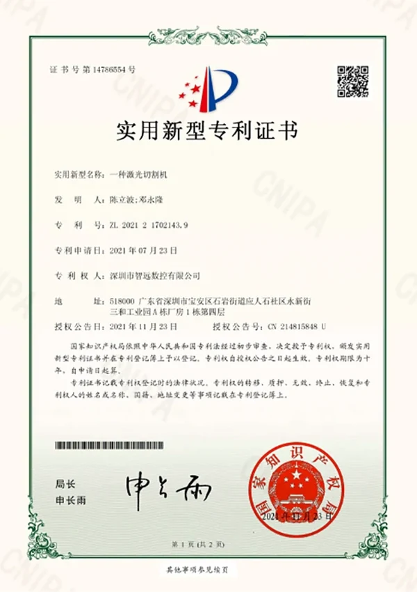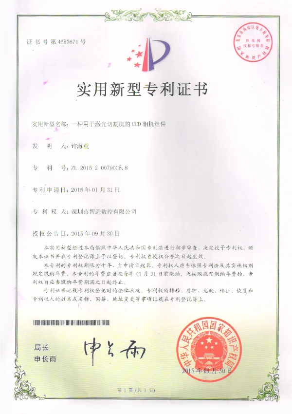 Deska obvodů; Metoda pro řezání vzorů fotografického papíru a jeho řezací zařízení laseru; Řezací stroj s duálním laserem; Řezací stroj laseru na základě vizuálního rozpoznávání; Zařízení pro přepínání optické cesty laseru; Řezací stroj laseru; Přenosové zařízení pro laserový řezací stroj; Sestava kamery CCD pro laserový řezací stroj;