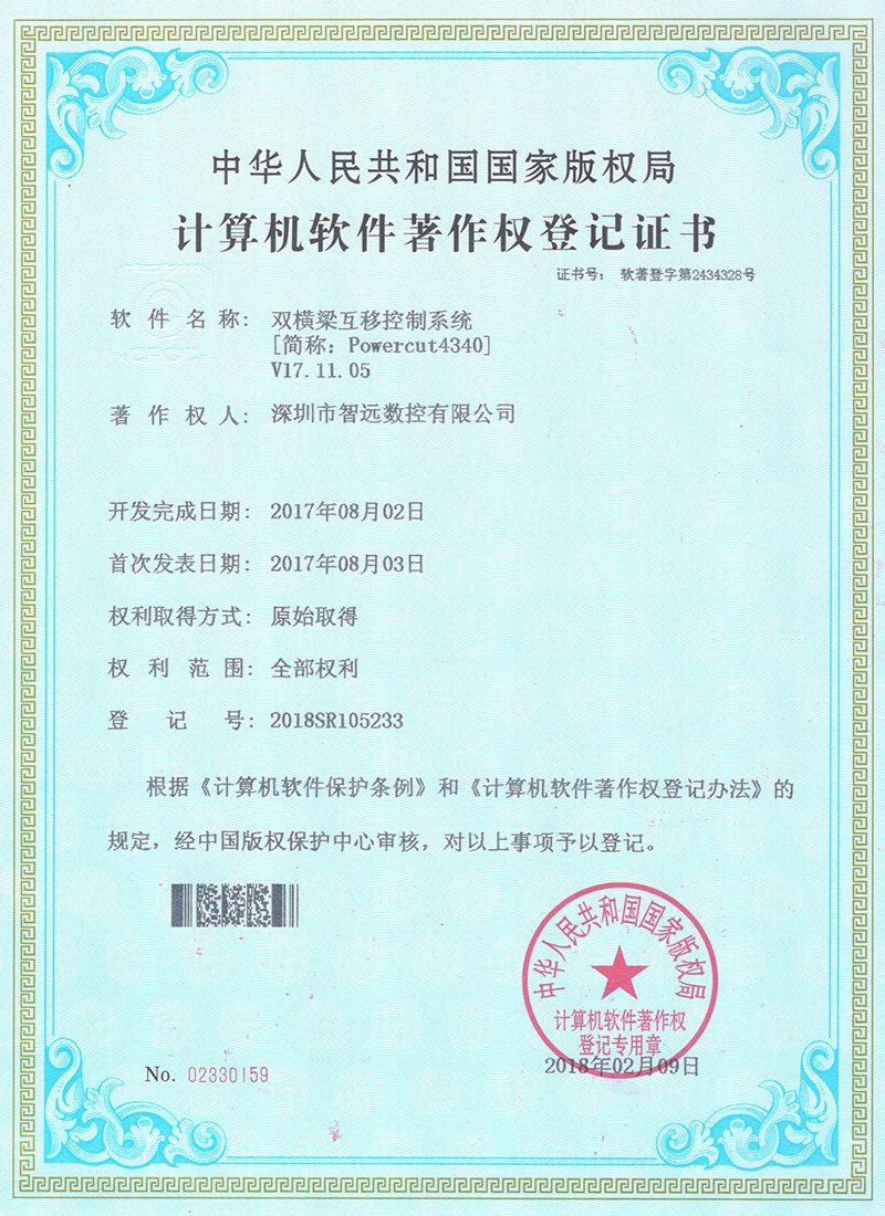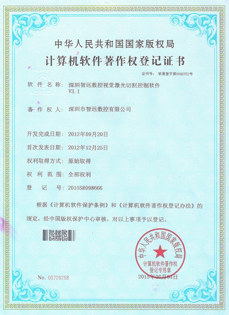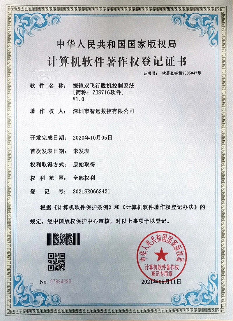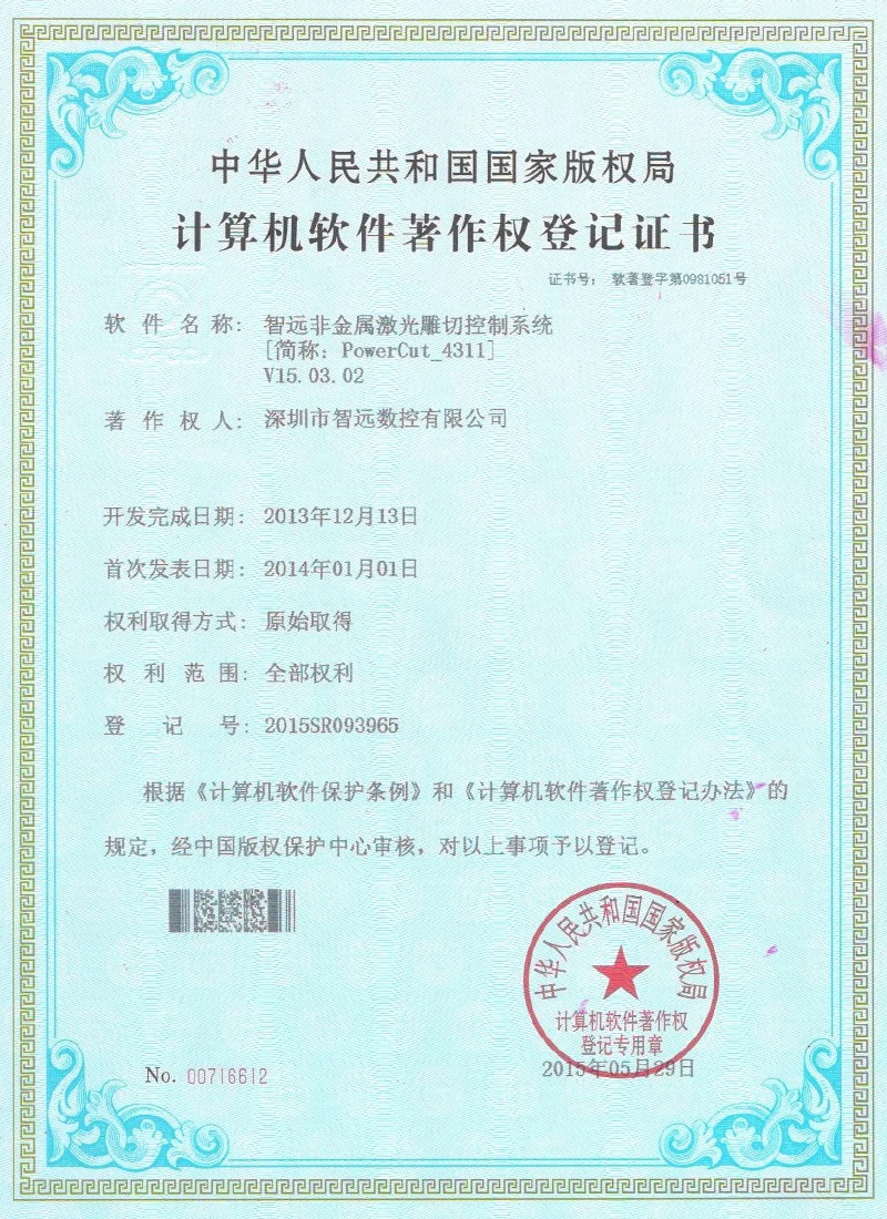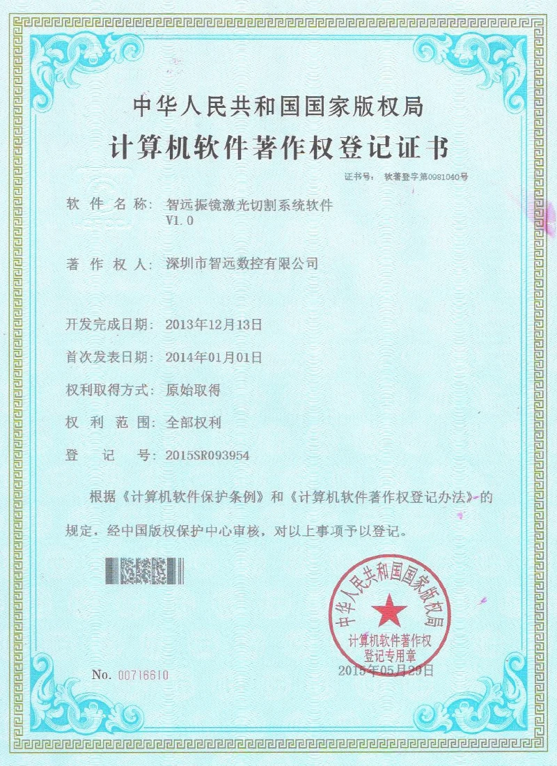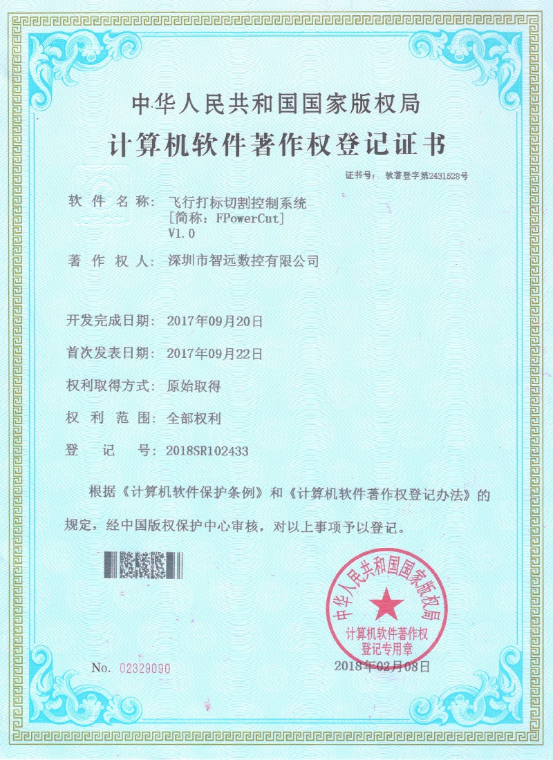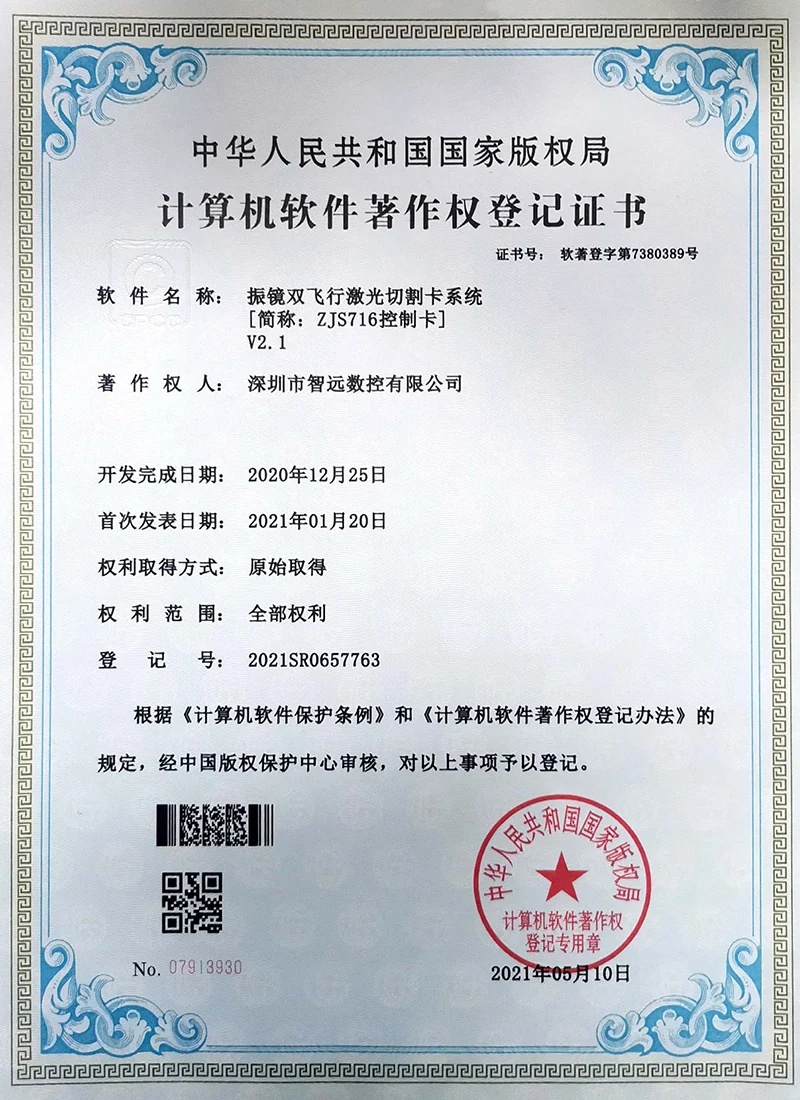 Projekce online laserového ovládacího systému; Mark Point Vision Online Laser Control Software; Galvanometr s dvojím letem offline řídicí systém; Systém řídicí karty vibrací V2; Systém ovládací karty pro malou vidění online automatické zamykání strojů v12; Systém strojů na okna; Software pro řezání laserového laseru Zhiyuan; Systém řízení vzájemného pohybu dvojitého paprsku; Shenzhen Zhiyuan CNC vizuální kontrolní software pro řezání laseru.